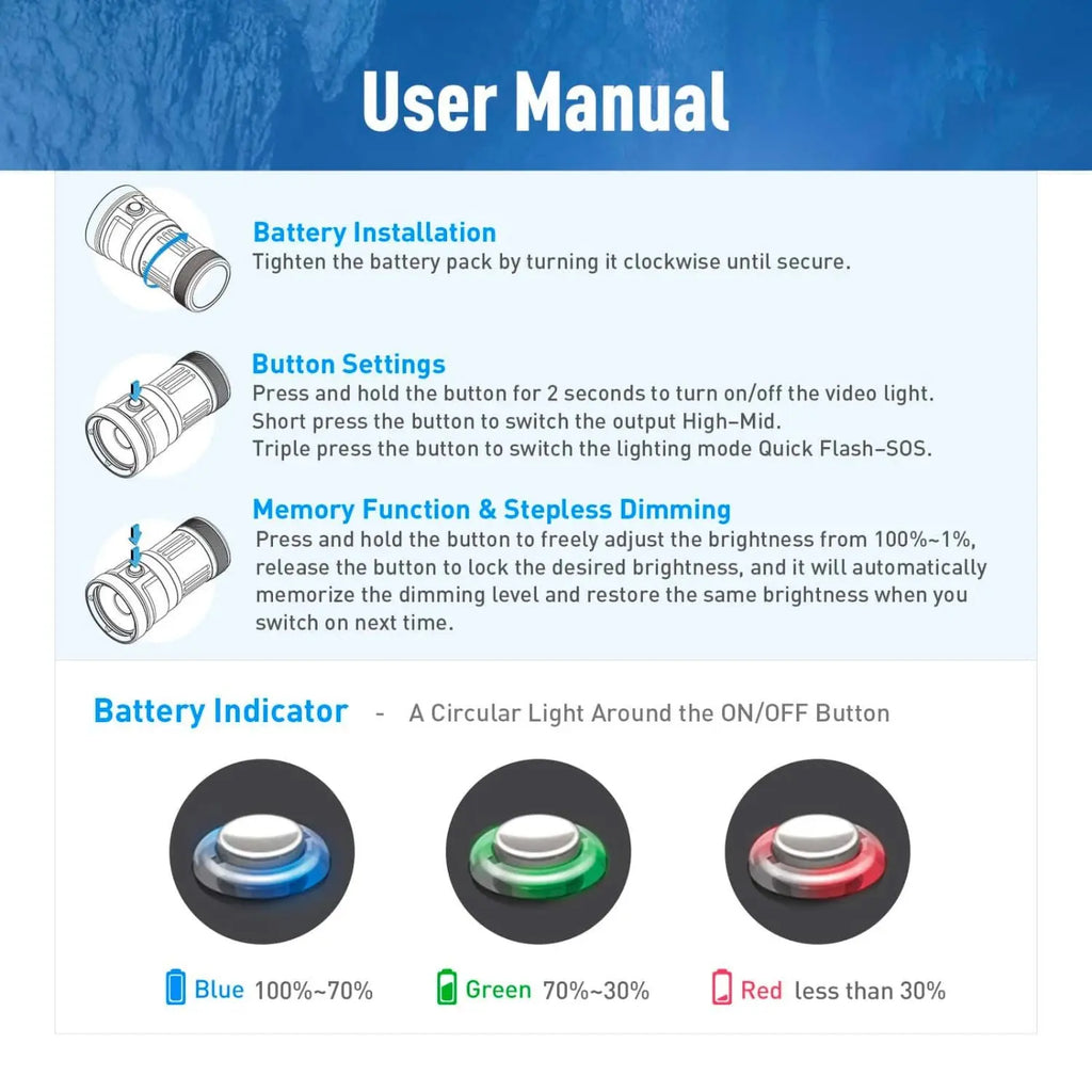 Kompakte, robuste Videoleuchte mit CREE-LED, stufenloser Dimmung, hoher CRI-Wiedergabe und langer Laufzeitoption durch wechselbare Akkupacks. Entwickelt für Foto- und Videoeinsatz unter Wasser, mit zuverlässig wasserdichtem Schalter und anwenderfreundlichem Handling.