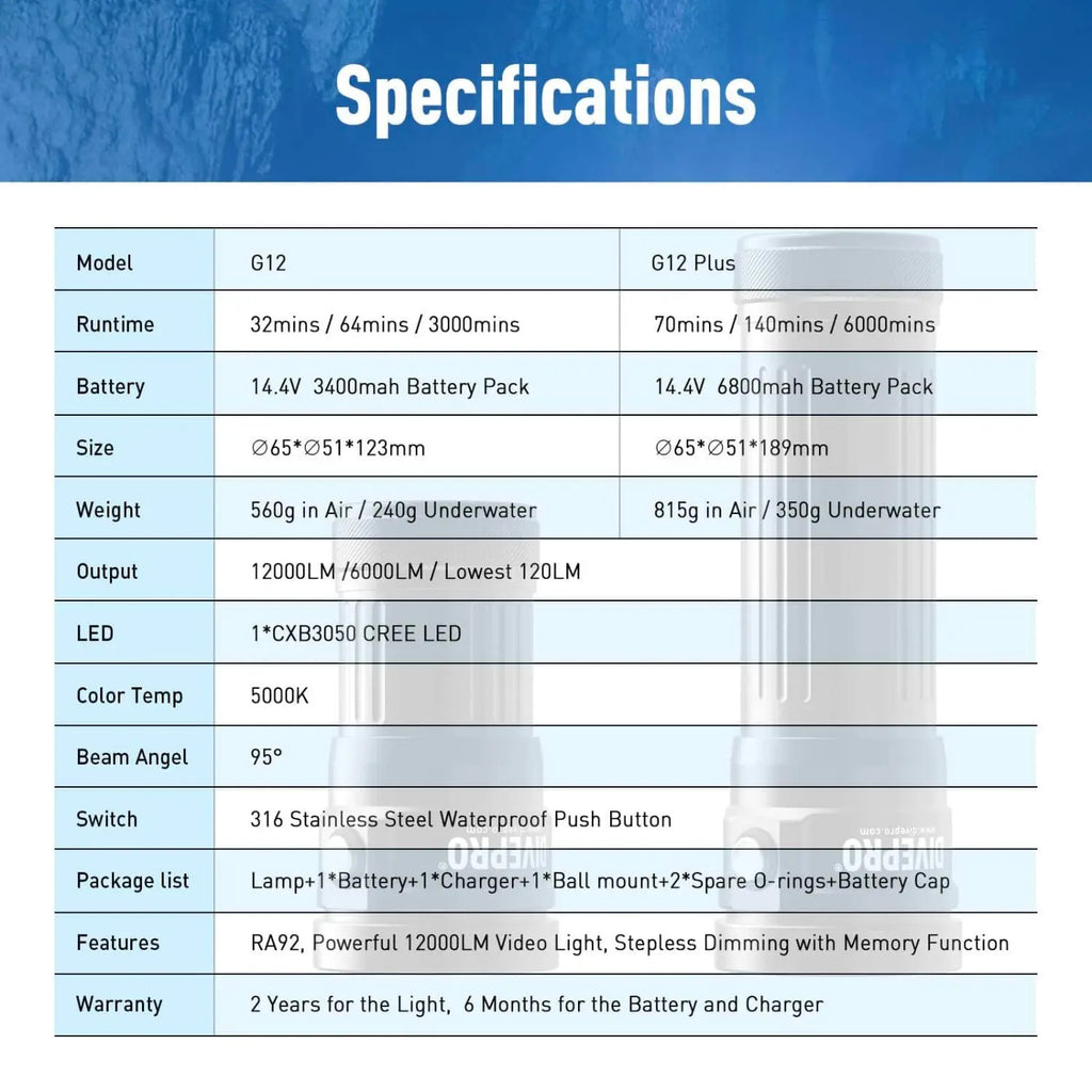 Die Divepro Videoleuchte G12 Plus V2 bietet kraftvolle 12.000 Lumen, breite Ausleuchtung und eine hohe Farbwiedergabe – ideal für Unterwasserfotografie, Videografie und anspruchsvolle Tauchgänge.