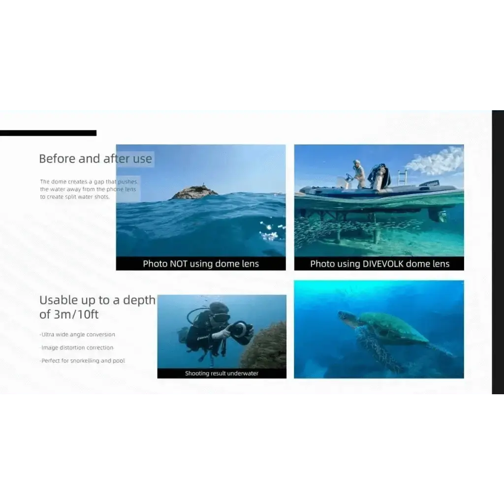 Erleben Sie das Besondere: Mit der DiveVolk Dome Lens kombinieren Sie nahtlos Oberflächen- und Unterwasserwelten. Ideal für Korallenriffe, Schiffswracks oder Sonnenuntergänge über dem Meer – Ihre Fotos werden zum Highlight!