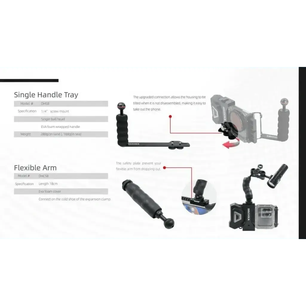 Der Divevolk Single Handle Tray (Modell DHSB) ist speziell für die SeaTouch 4 Serie, Kompaktkameras, Action-Cams wie GoPro, DJI Action oder Insta360 entwickelt. Er ermöglicht einhändiges Handling in anspruchsvollen Unterwasserumgebungen und lässt sich nahtlos mit Videoleuchten erweitern. Dank der cleveren Drehfunktion können Sie Ihr Smartphone bequem herausnehmen, ohne das Gehäuse zu zerlegen – einfach Schrauben lockern und schon ist es erledigt.