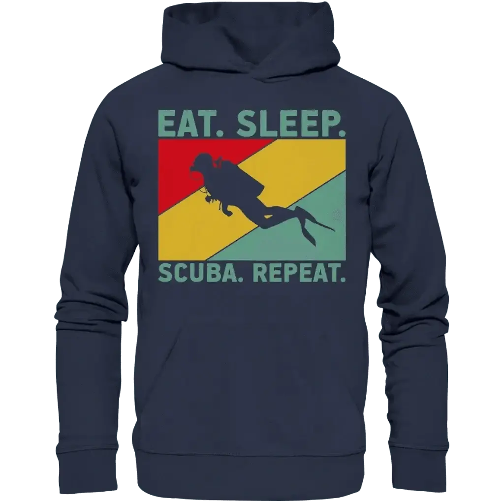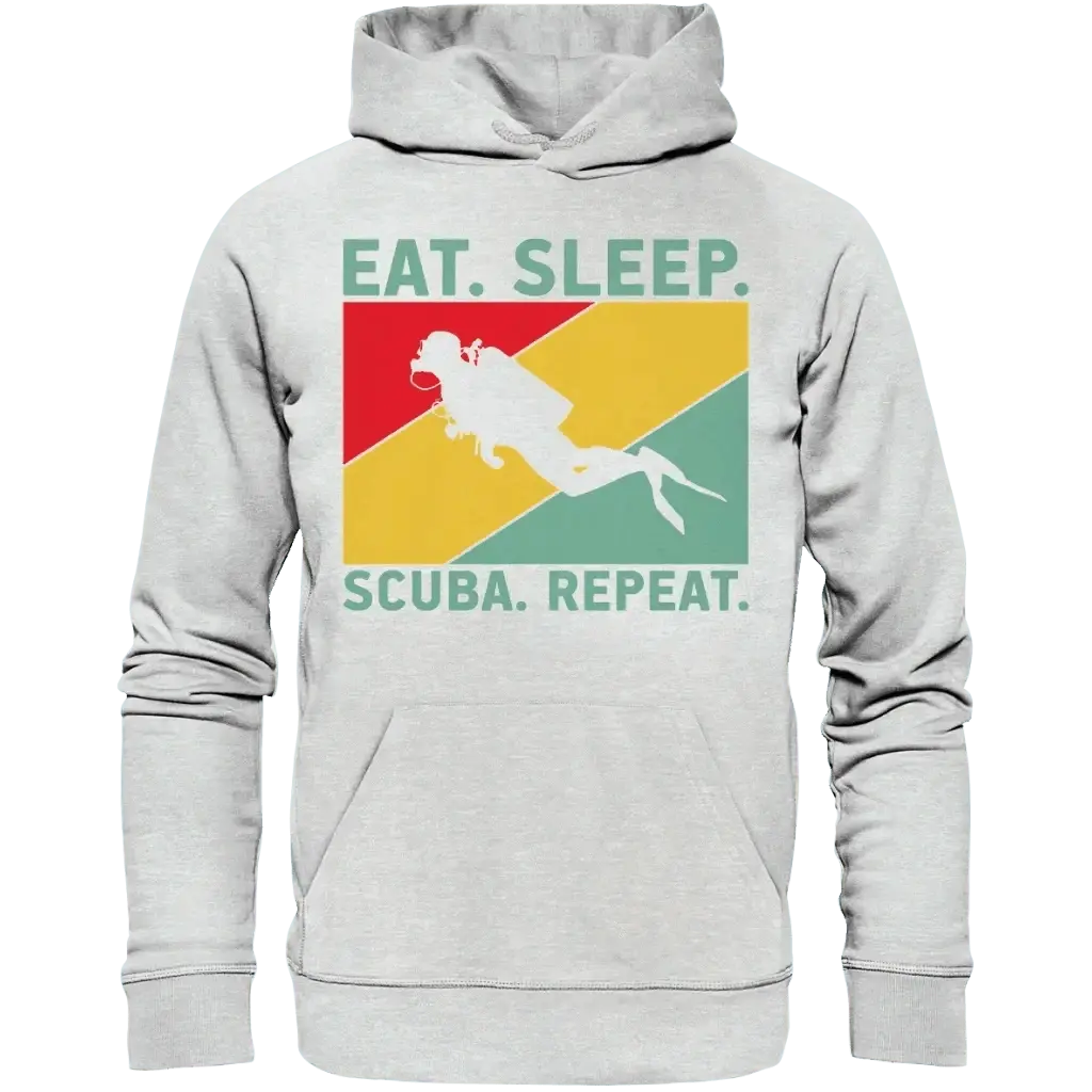 Perfekt für Taucher: Der "Eat Sleep Scuba Repeat" Premium Unisex Hoodie von Tauchwerkstatt.eu verbindet maritimes Design mit robustem Tragekomfort und ist der ideale Begleiter für Tauchgänge, Bootsfahrten und die Zeit an Land.
