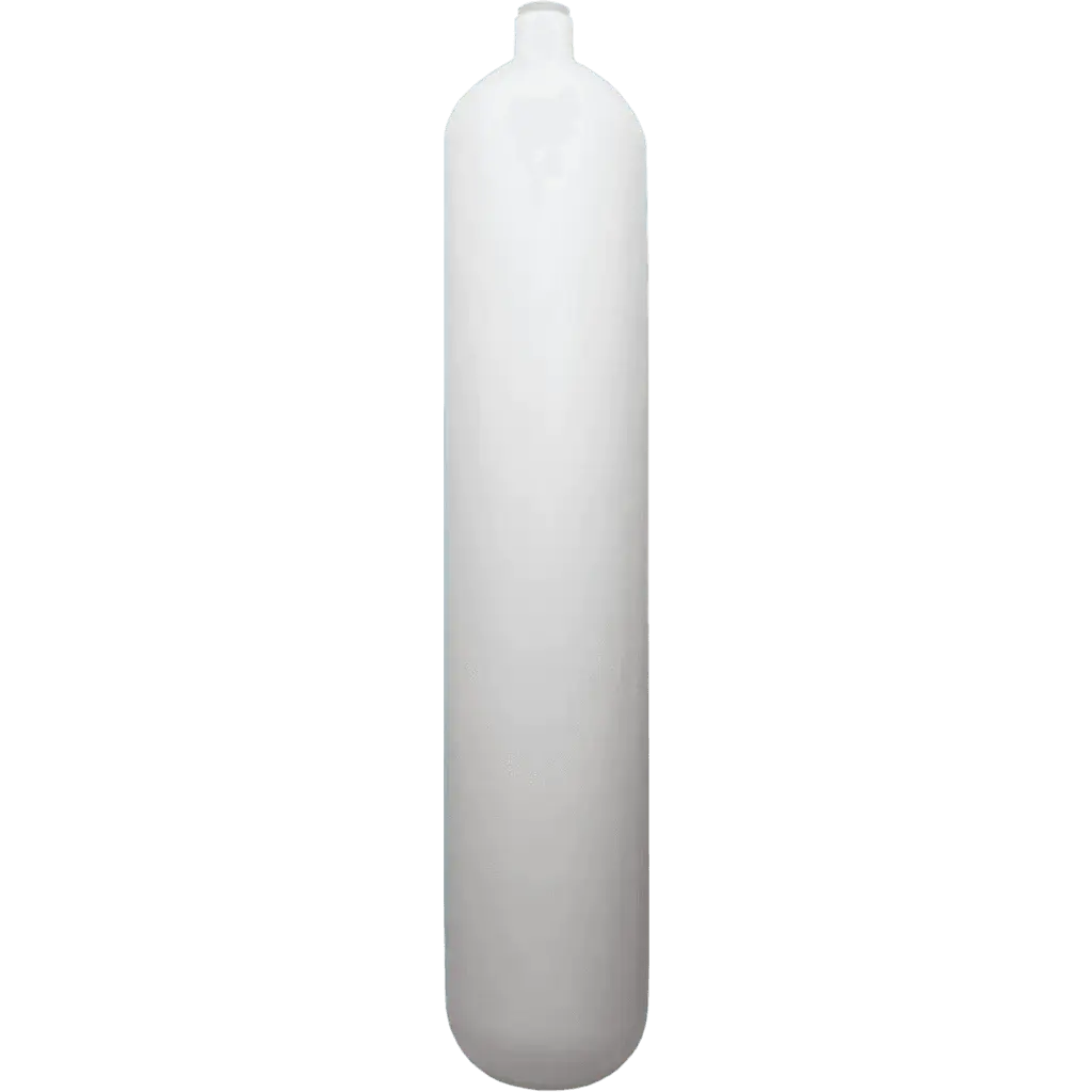 Robuste, kompakte Stahlflasche für Sport- und Technical-Diving – 8,5 Liter bei 232 bar, Durchmesser 140 mm, konkaver Boden, weiße Lackierung.