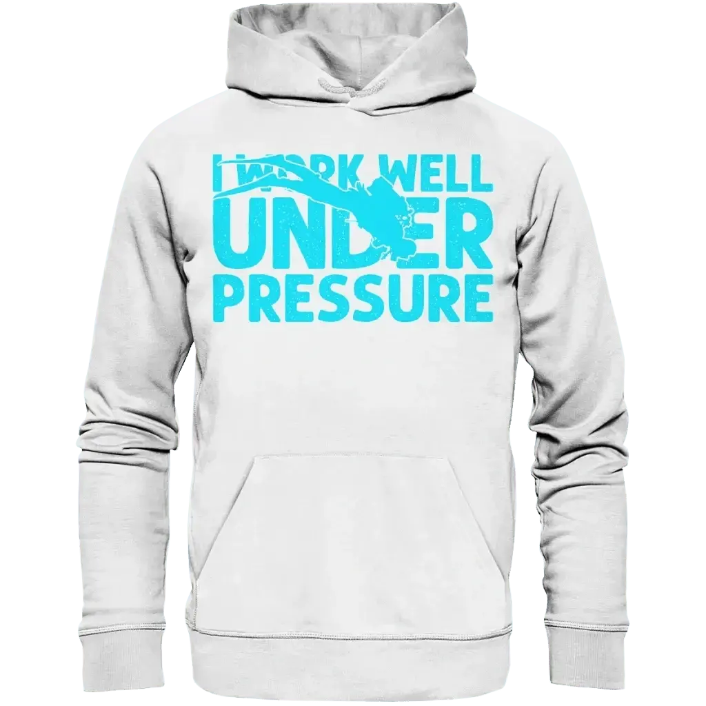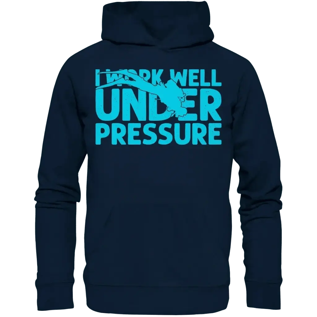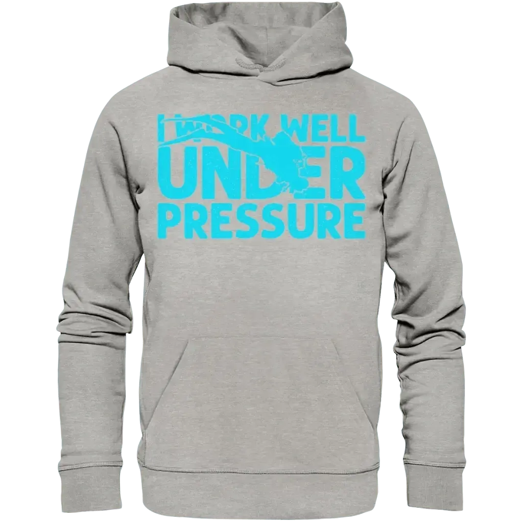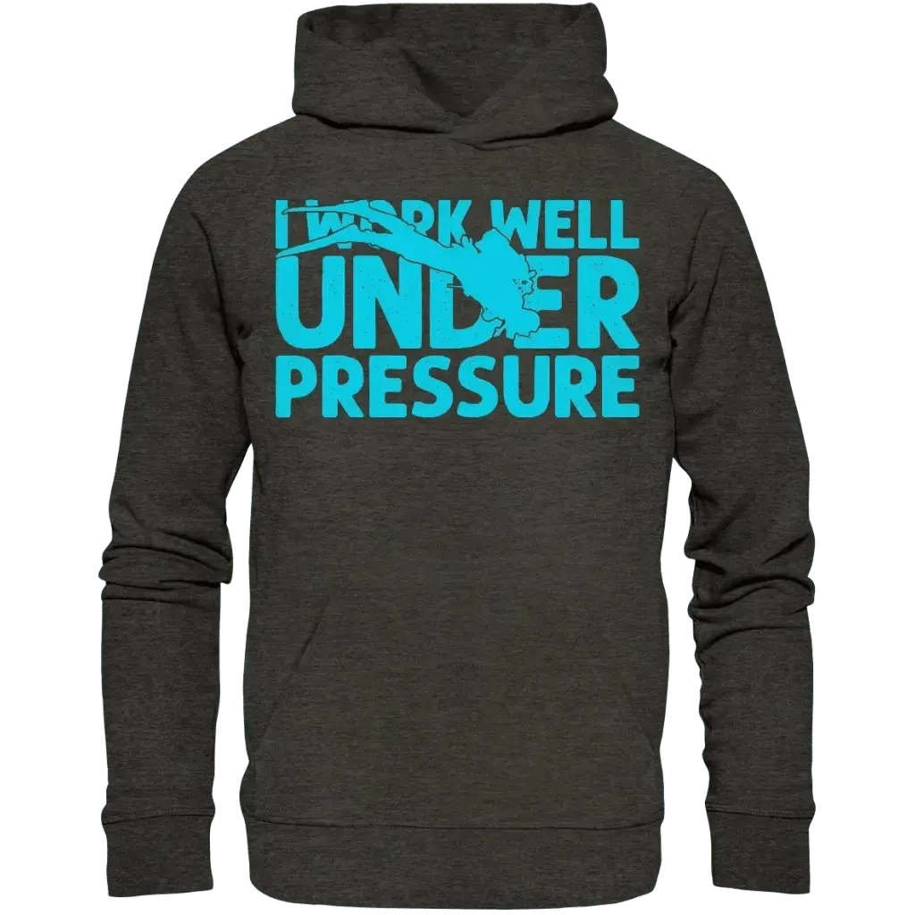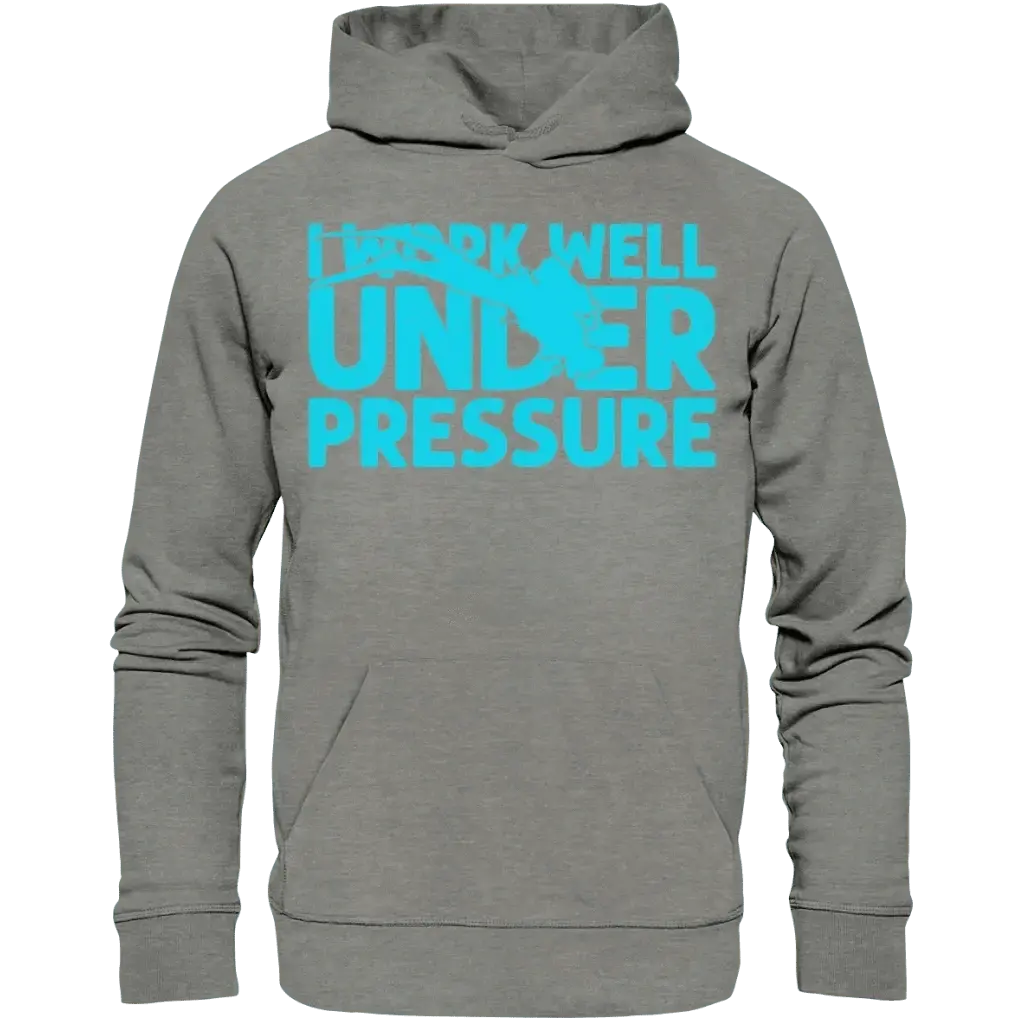 Der "I work well under pressure - Organic Hoodie" ist exklusiv bei Tauchwerkstatt.eu erhältlich und eignet sich hervorragend als Geschenk für Taucher, Tauchschulen oder als persönliches Statement für Unterwasserfans.