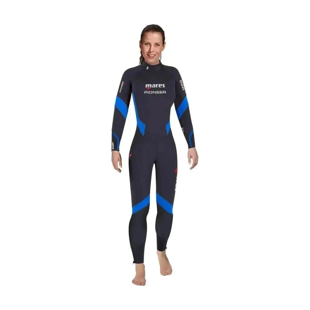 Der Pioneer 7 SheDives ist ein Kaltwasser-Nasstauchanzug aus Neopren & Ultrastretch Neopren, der Bequemlichkeit, einfaches Anziehen und Komfort bietet. Das Design ist jetzt moderner in blau getönten Neopreneinsätzen. Der neue Pioneer behält seinen charakteristischen Rückenreißverschluss bei. Ausgestattet mit Reißverschlüssen an den Knöcheln zur Vermeidung von Zwängen beim An- und Ausziehen. Der Pioneer Neoprenanzug hat einen hinteren Halsverschluss. Er verfügt außerdem über einen Reißverschluss mit Scheuerschutz und einen großen Bereich an beiden Handgelenken, um den am Handgelenk getragenen Computer zu halten. Ein zusätzliches Merkmal ist der Kappenhaken, der am Bein eingesetzt ist. Die Haube von Pioneer verwendet außerdem eine Konstruktion, die den Luftausgleich und die Luftabgabe im Ohr und im oberen Bereich optimiert. Die Hauptmerkmale des Pioneer 7 SheDives Neoprenanzugs sind: - Reissverschlüsse (nur bei der 7mm-Version) an Fussknöcheln vereinfachen das An- und Ausziehen - Die Haube ist mit einem System zum Ablassen der Luft ausgestattet, was den Druckausgleich erleichtert - Neuer Halsverschluss mit abriebbeständigem VELCRO®brand® verhindert die Beschädigung des Nasstauchanzugs - Beidseitig griffige Handgelenkeinsätze für Instrumente - D-Ring sm rechten Bein zum Anbringen der Haube - Kneepad aus verschleissbeständigem Material