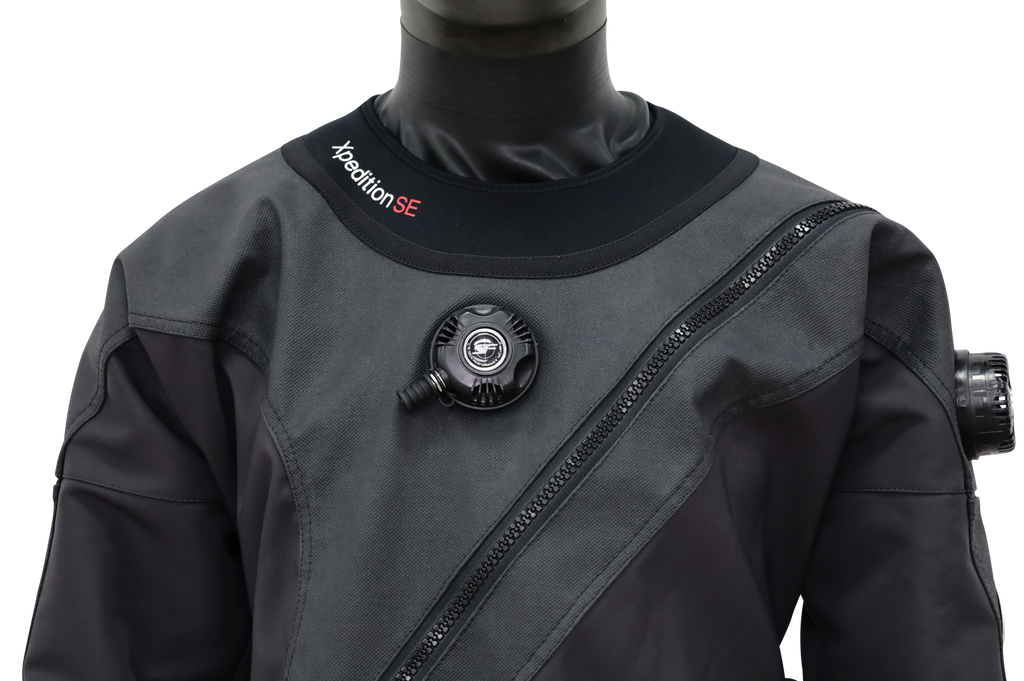 Material: Der Xpedition SE Trockentauchanzug besteht aus einem robusten, aber leichten, speziell entwickelten Trilaminat-Material, das eine verbesserte Haltbarkeit und Beweglichkeit bietet.