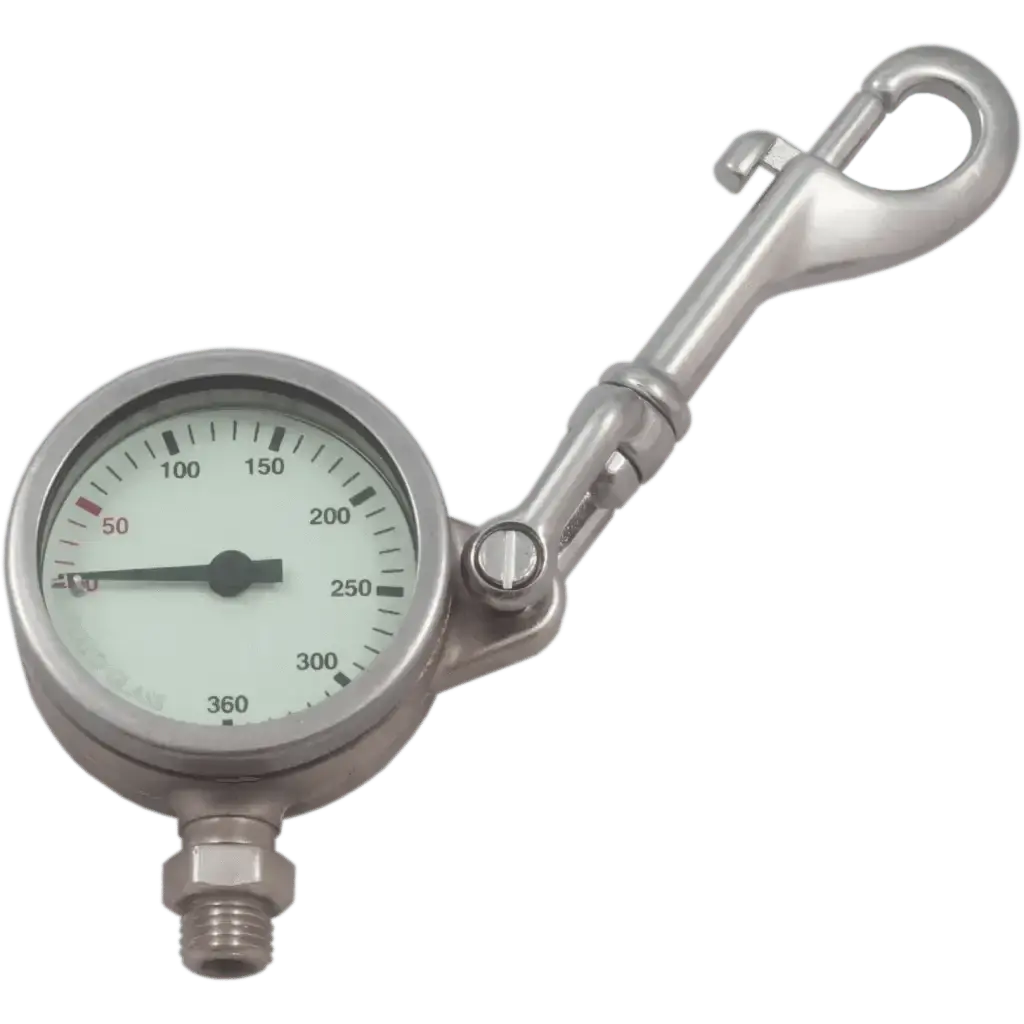 Perfekt für DIR-Taucher und alle, die Wert auf Qualität legen: Das vernickelte **Finimeter SPG 52mm** bietet synoptische Skala für schnelle Druckablesung. Es ist robust, präzise und ein Dauertestieger unter Profis. Ob Freiwassertauchgang oder Tekktauchgang – mit diesem SPG bleiben Sie immer im Bild.