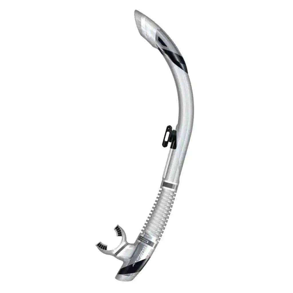 The SV2 combines the Scupper Valve lower section with the sleek looking SV2 Semi-Dry top. The SV2 Semi-Dry top horizontal vents diffuse splashed water that would normally freely enter the snorkel top. Features include: easy on / off snorkel clip system, flexible drop away hose, a dual silicone mouthpiece and rotational mouthpiece with ratchet indicators.