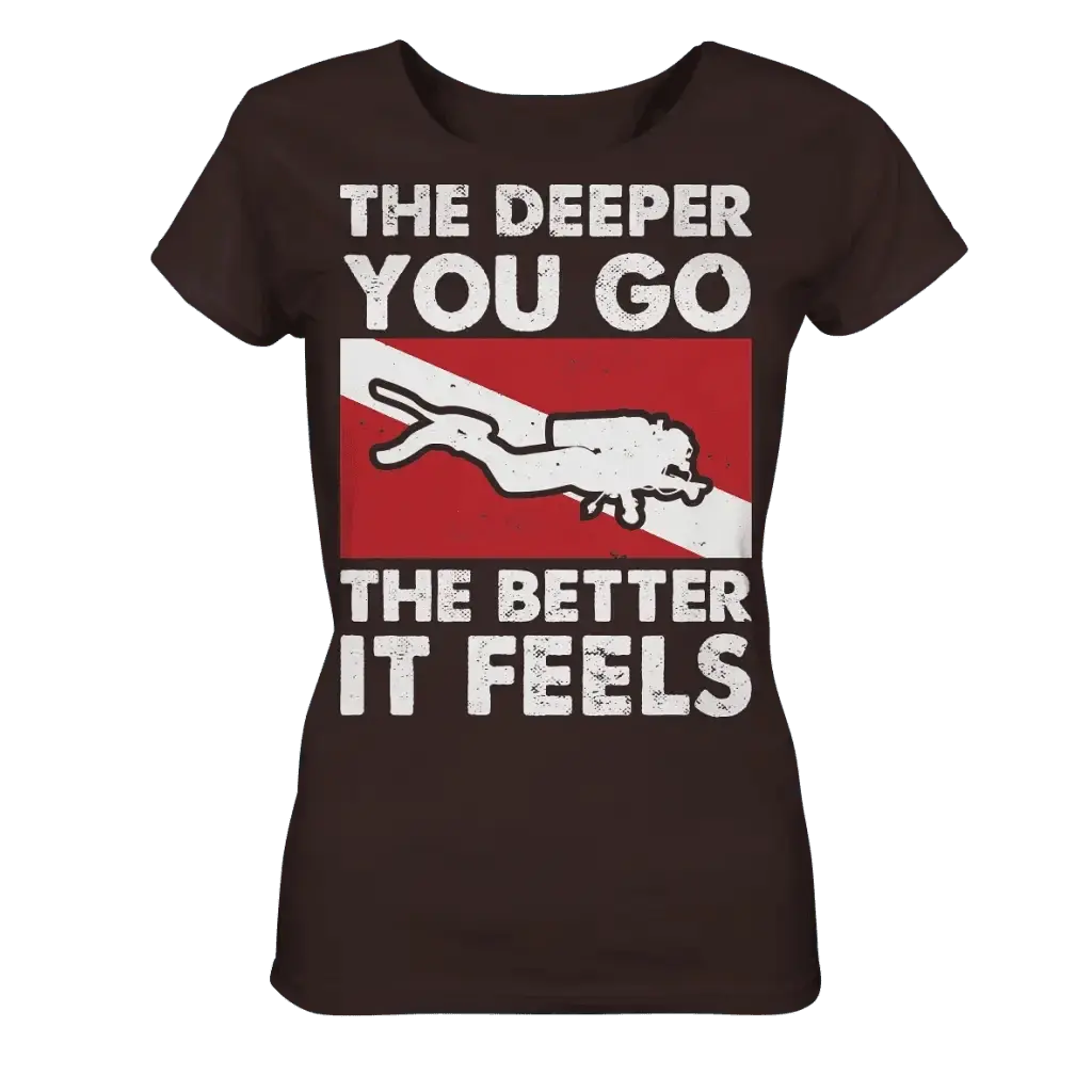 Das Shirt mit dem Slogan "The Deeper you Go the better it feels" ist der Hit für alle leidenschaftlichen Taucherinnen. Es feiert die Faszination der Unterwasserwelt und motiviert zu neuen Tiefen. Ob beim Vorbereiten deines nächsten Dives oder im Alltag – dieses Bio Taucher Shirt Damen bringt Tauch-Feeling überall hin.[2][3][10]