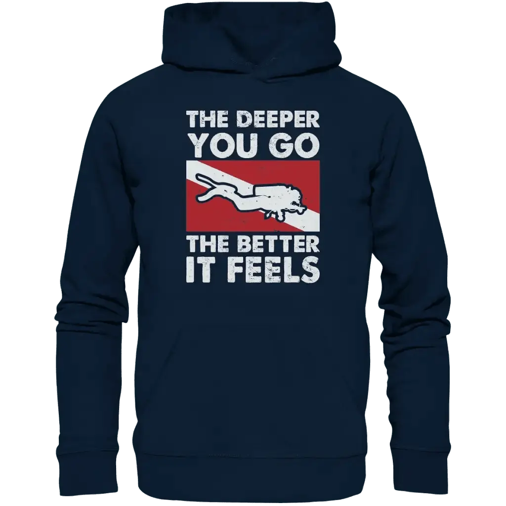 Tauche ein in Komfort und Stil – bestelle deinen The Deeper you Go the better it feels Organic Hoodie jetzt bei Tauchwerkstatt.eu!