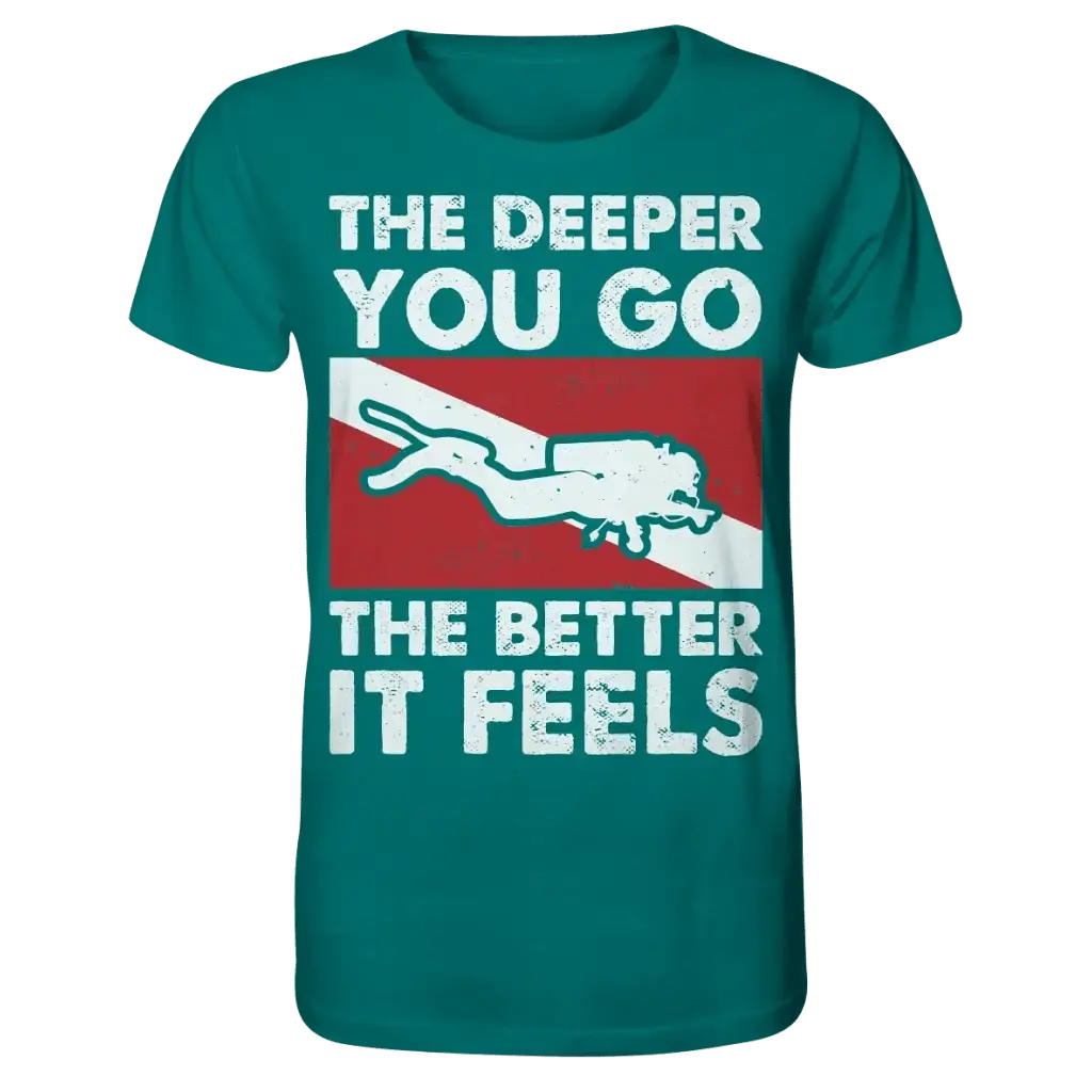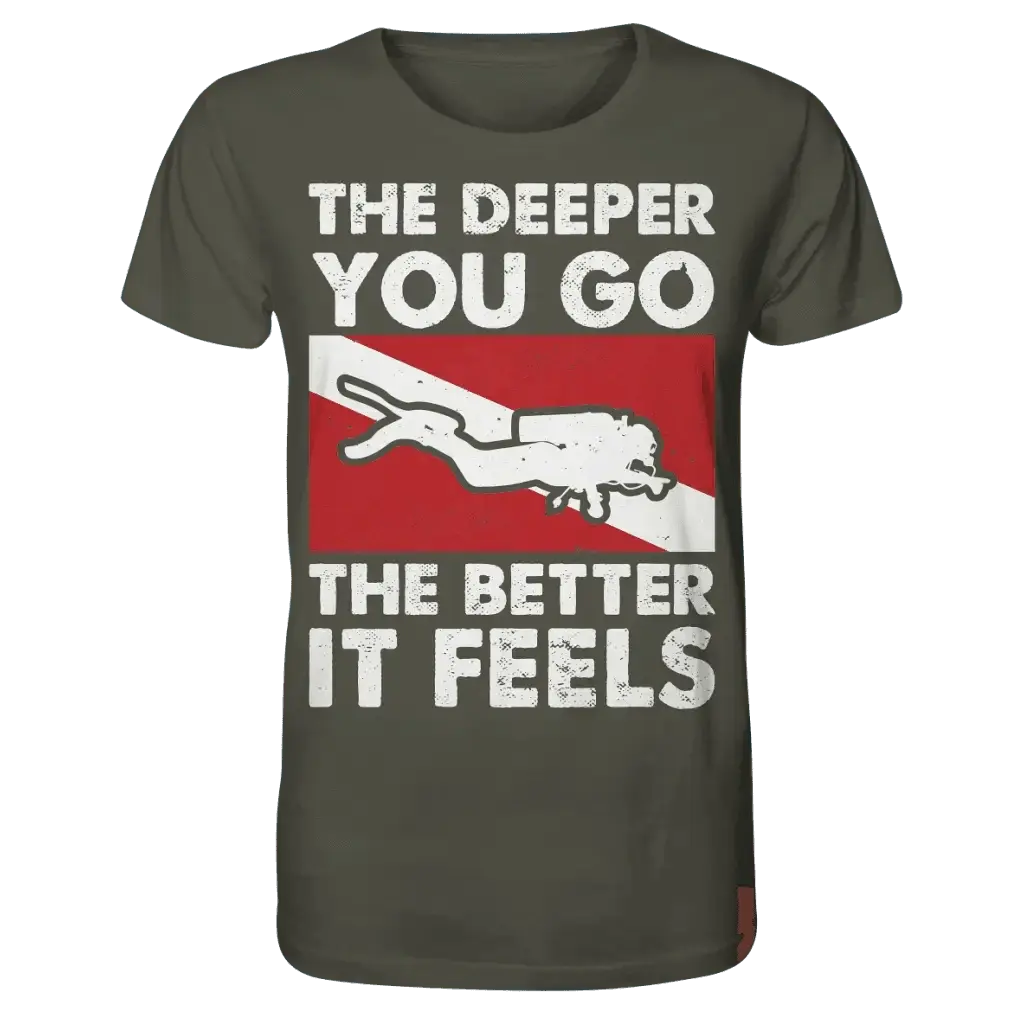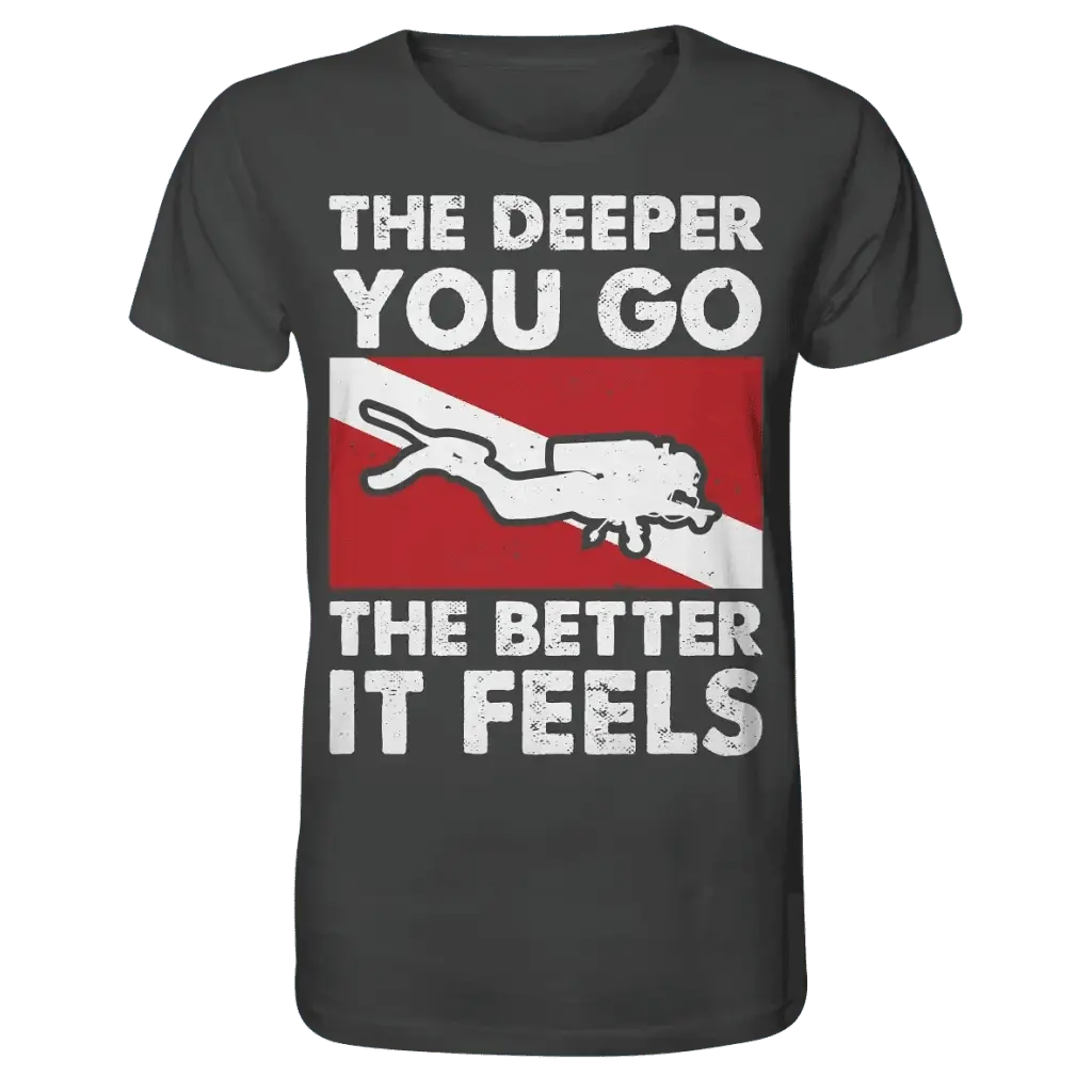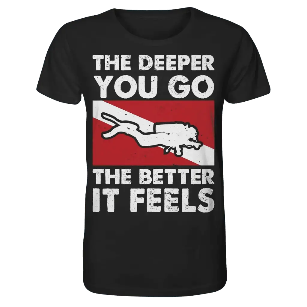 Das perfekte Shirt für Taucherinnen: Das „The Deeper you Go the better it feels“ Organic Shirt verbindet maritimen Lifestyle mit nachhaltigem Komfort und ist speziell für Taucherinnen entworfen.