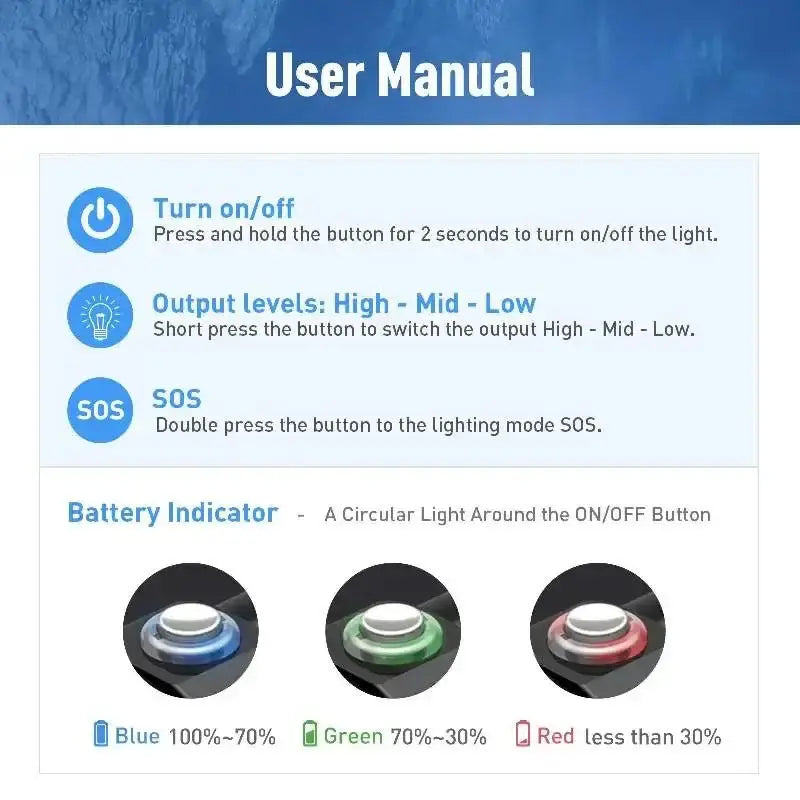 Der robuste **316-Edelstahl-Druckknopf** ist kinderleicht: 2 Sekunden drücken zum Ein-/Ausschalten, kurzer Druck für Modi (Hoch-Mittel-Niedrig), Doppelklick für SOS-Modus. Ein farbiger **Akku-Anzeiger** (Blau: 100–70 %, Grün: 70–30 %, Rot: unter 30 %) hält Sie informiert. Die **DIVEPRO D40F** ist die zuverlässige Begleiterin für Freizeit- und Profitaucher.