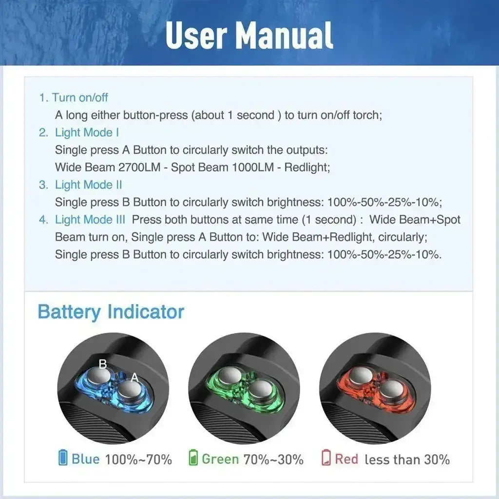 - Höchste Leuchtkraft: Wide Beam bis 2700–4200 Lumen, Spot Beam 1000 Lumen, Rotlicht 500 Lumen – für brillante Beleuchtung in jeder Tiefe.