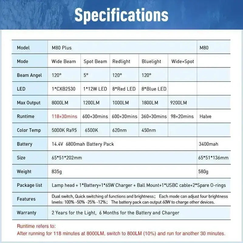 Die DIVEPRO M80 bietet eine durchdachte Kombination aus hoher Leuchtleistung, variabler Strahlführung und praktischen Funktionen, die sie zu einer starken Wahl für Hobby- wie Profi-Taucher macht, die unter Wasser zuverlässige, flexible Beleuchtung für Fotos und Videos benötigen.
